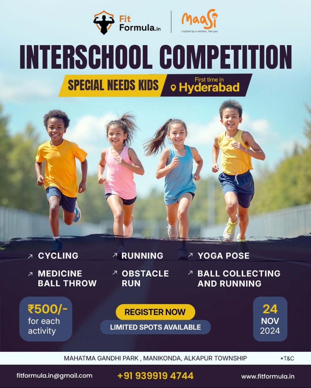 FitFormula’s Interschool Competition for Special Needs Kids was held at Mahatma Gandhi Park, Manikonda, featuring 55 children from 15 schools, with activities like obstacle runs and yoga performances. Beyond Spectrum was named the overall champion.